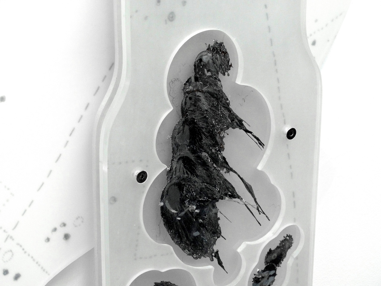 Layers 2 and 3 are sanded perspex with imagery of star maps drawn in pencil. Layer 2 has several lead-solder splashes inserted which act as an ionic dynamic layer communicating by filaments above the mapped substrates. As such it emulates an electrical layer within the navigation of the night sky.